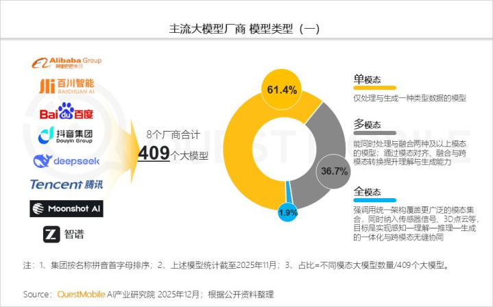 截止2025年11月,阿里巴巴、百度集团、抖音集团、腾讯等8个主流厂商,合计推出了409个大模型。其中,单模态、多模态和全模态占比分别为61.4%、36.7%、1.9%。值得注意的是,从2025年7月到11月,在短短五个月里配资吧官网最新信息,AI产业链完成了186起投融资,金额达到336.7亿元,较上半年增加20.8%,产业迎来资本蜂拥。